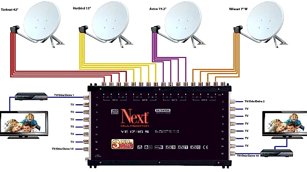 Iki adet uydu antenini, binanın çatısına kurup sistem merkezini de binanın asansör dairesi gibi korunaklı bir alanına monte ediyoruz.(Digitürk”te isteniyorsa 3. bir uydu anteni kurulur ve sistem dağıtım ekipmanları buna göre kullanılır).